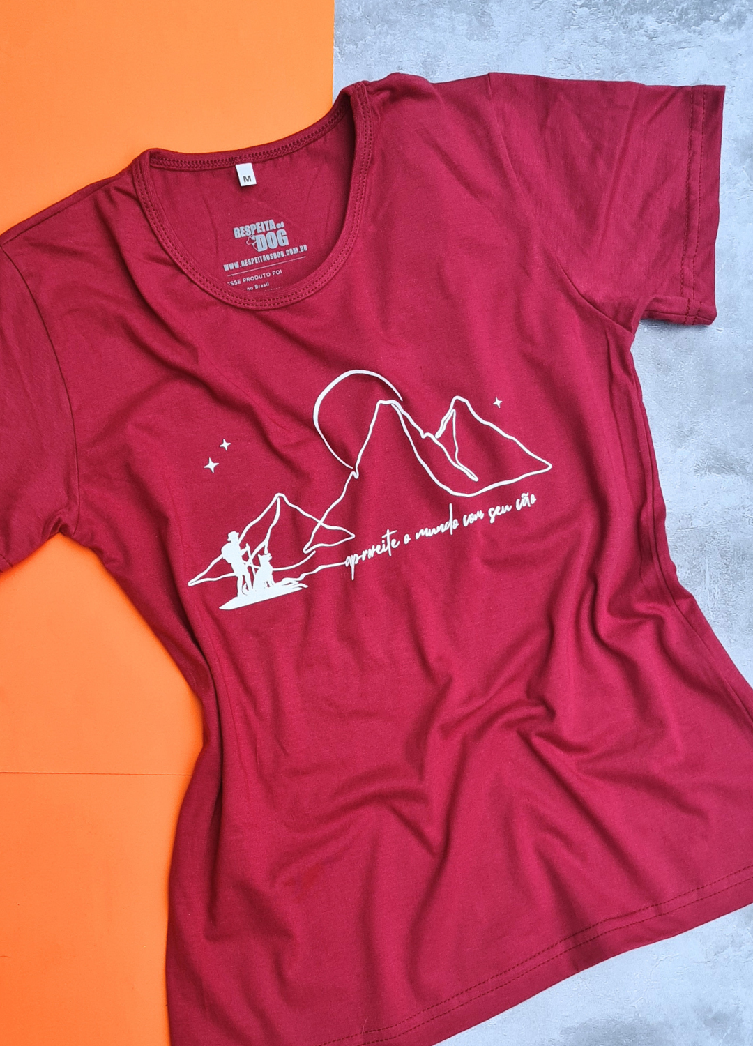 – Estampa na frente: "APROVEITE O MUNDO COM SEU CÃO", com ilustração de montanhas, pessoa e cachorro.