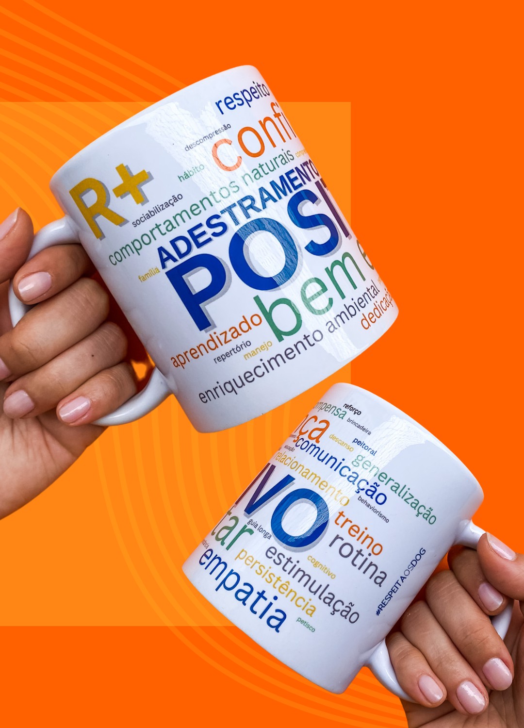 – Estampa “Adestramento Positivo”, com nuvem de palavras relacionadas ao tema. O texto é em azul marinho, laranja, amarelo, verde e cinza escuro. O fundo é branco liso.